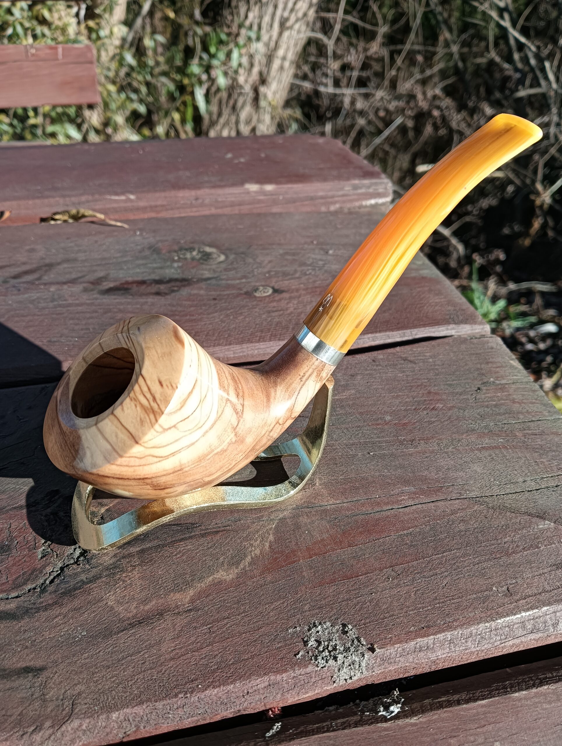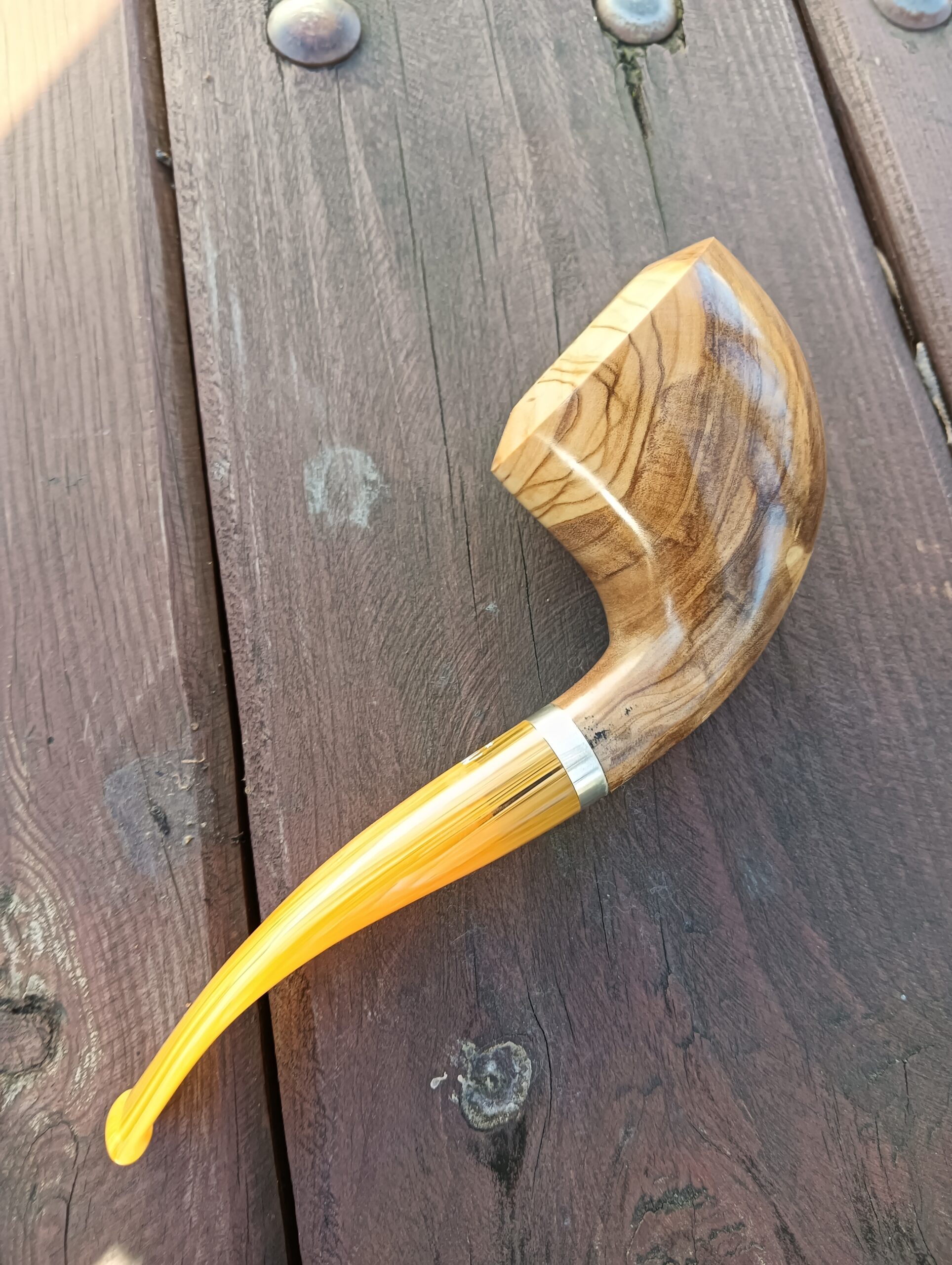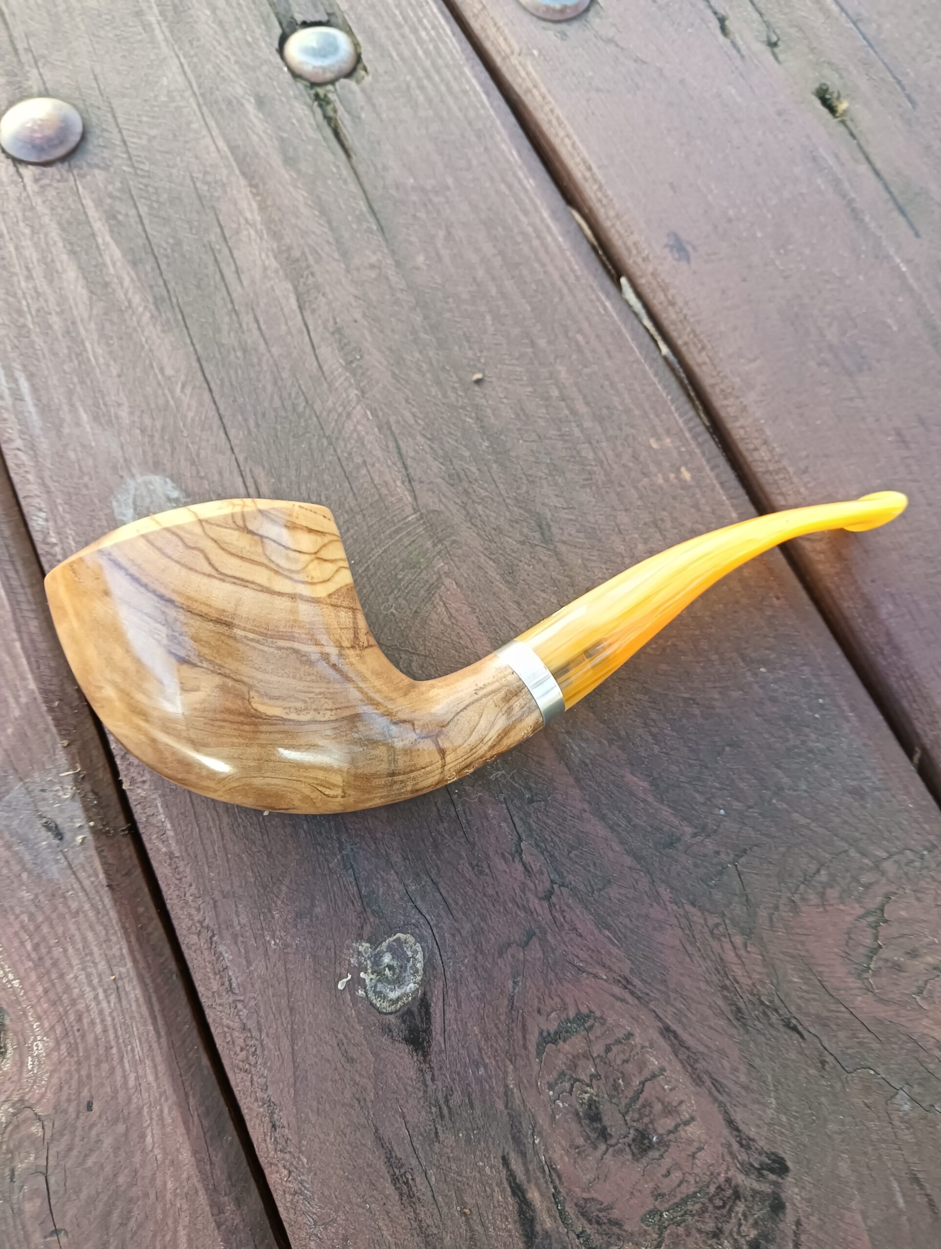 Bardzo ładna fajka, drzewo oliwne z Grecji , naturalne usłojenie drewna, tylko woskowana woskiem carnauba ,akrylowy ustniki na filtr 9mm w kolorze zòłtym , dodatkowo dołożona obrączka srebrna 925 dodaje szyku, prekarbonizowana