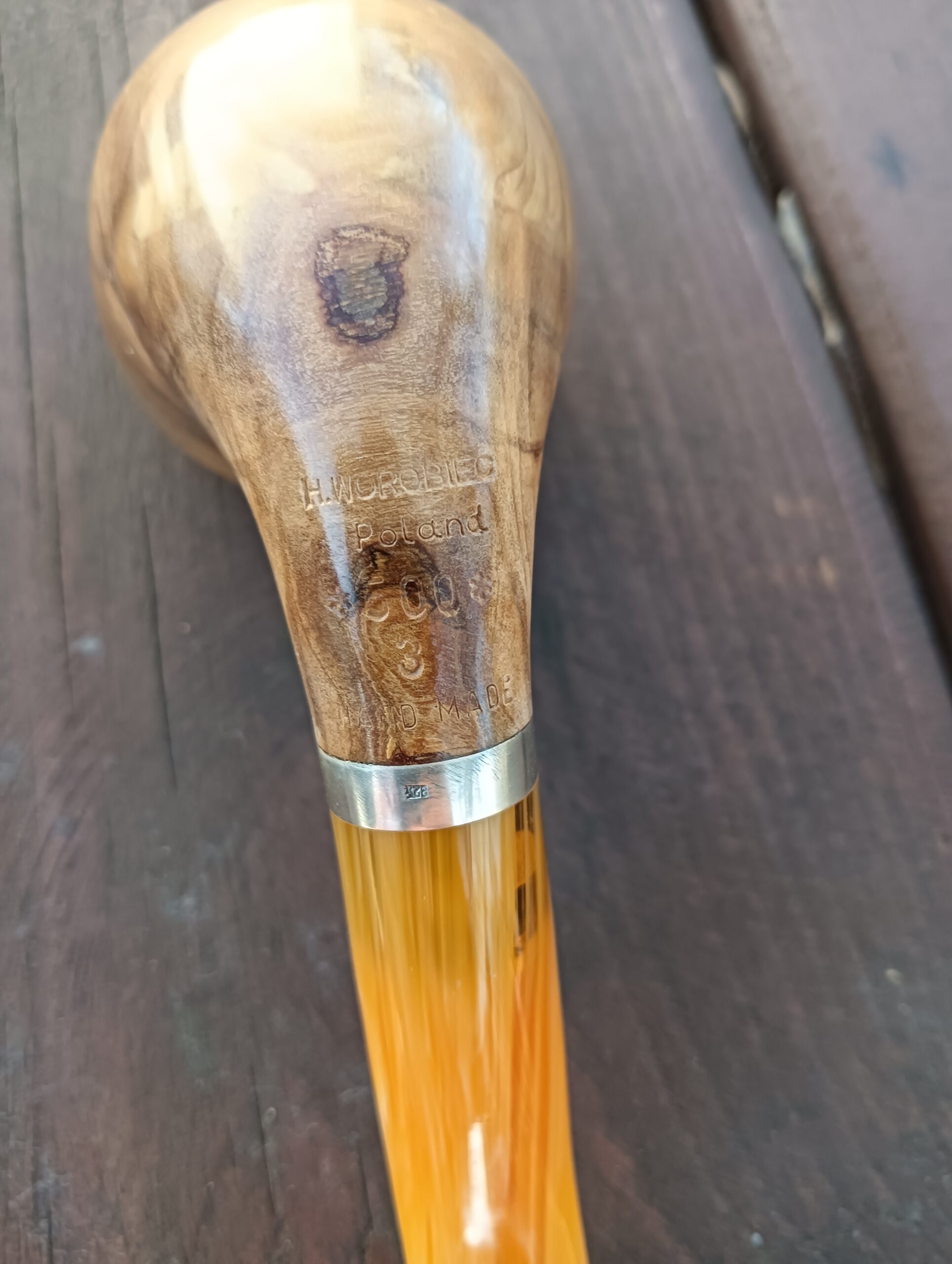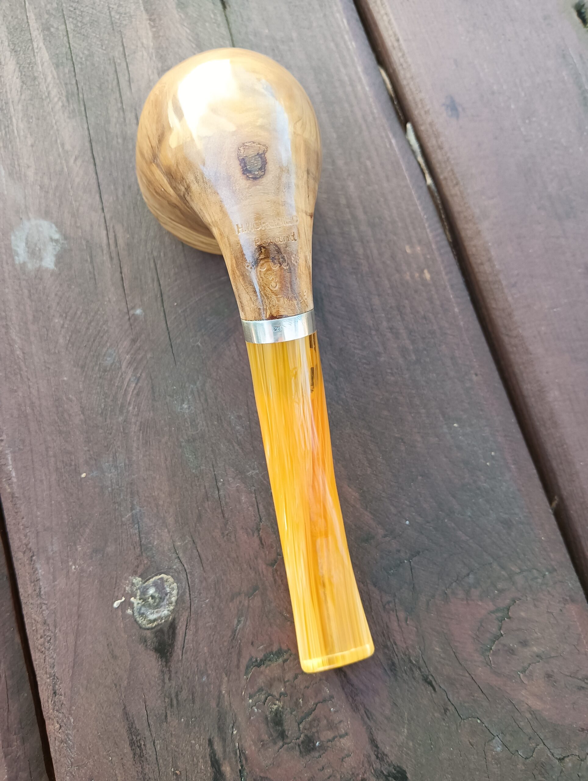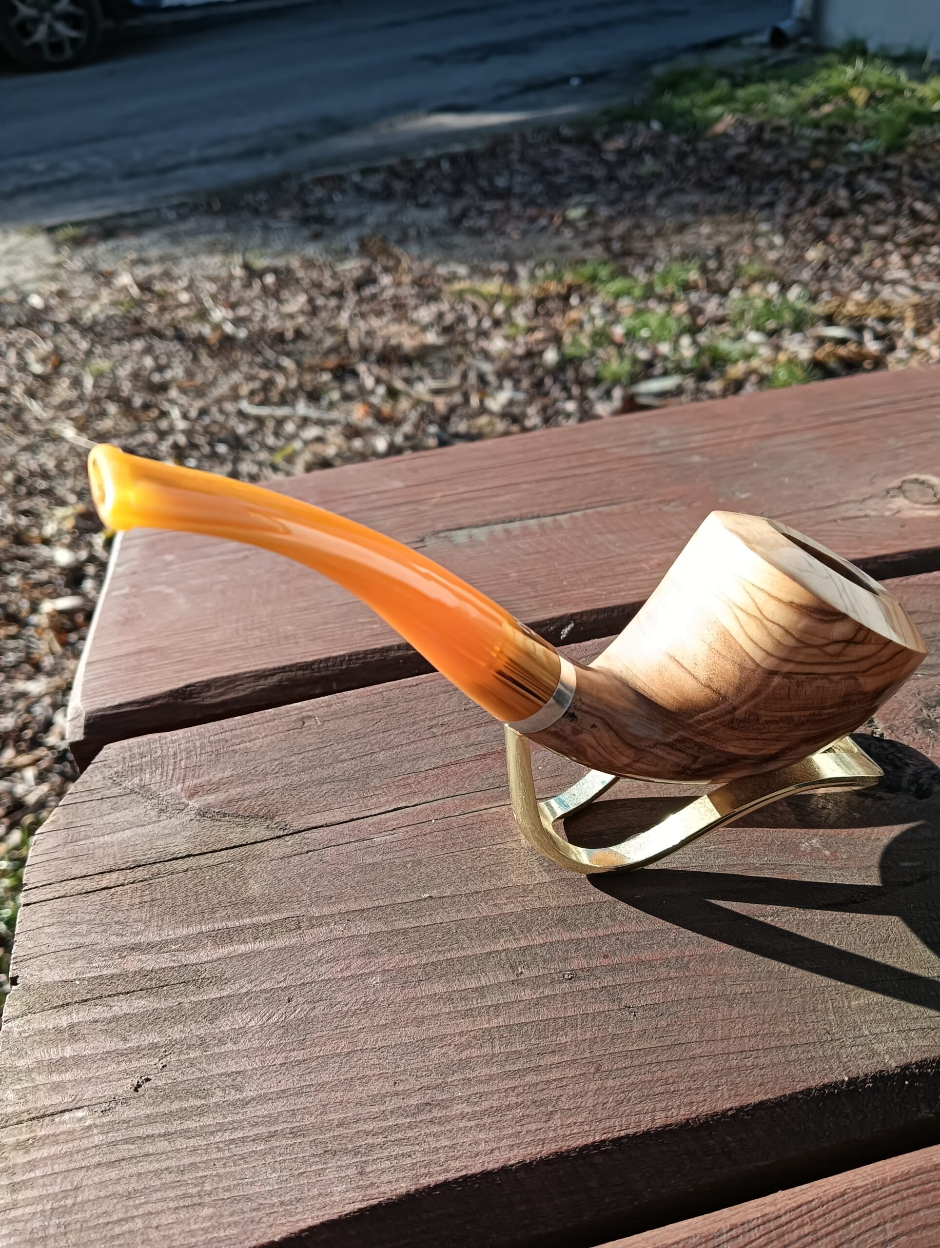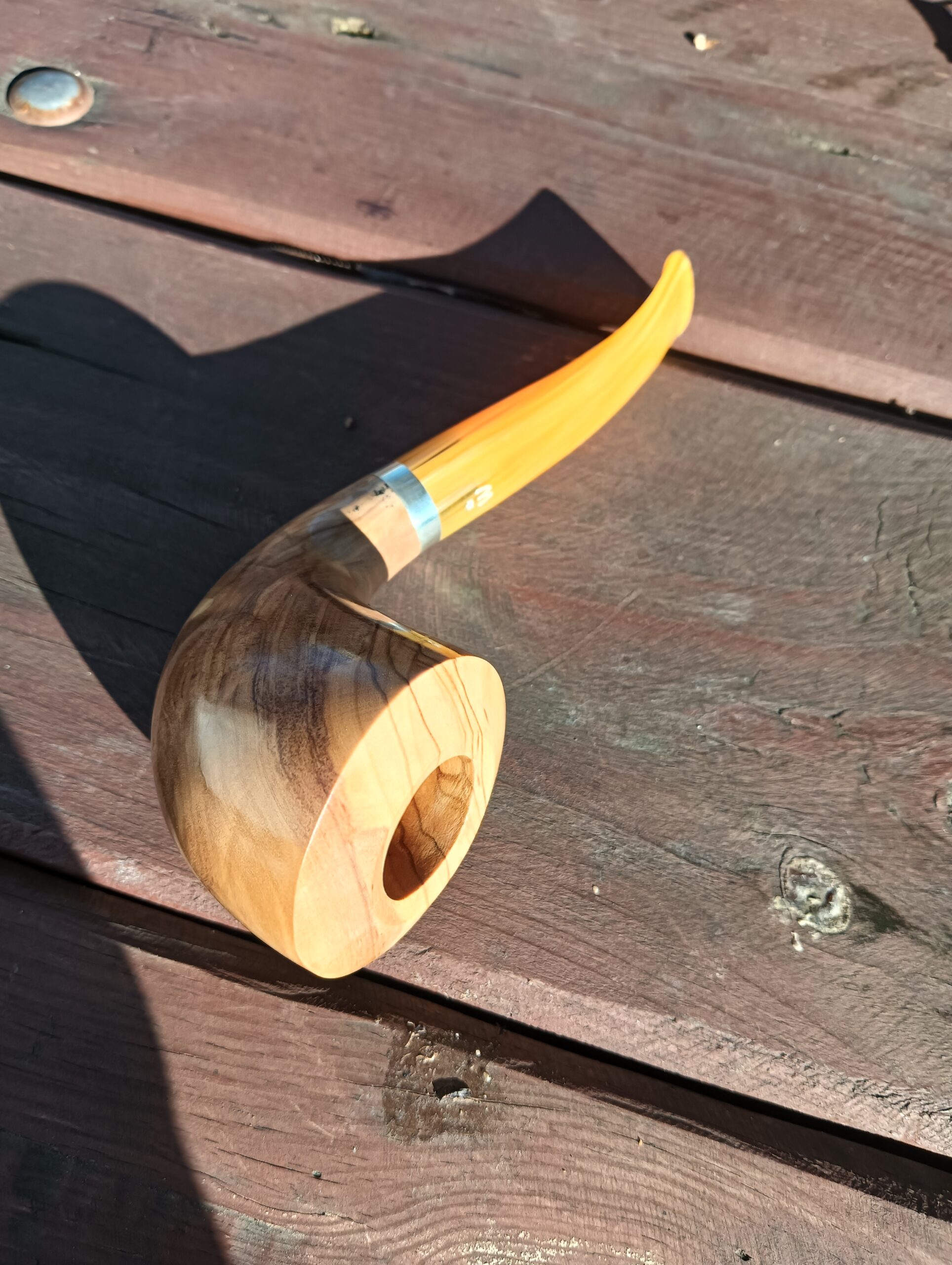 Bardzo ładna fajka, drzewo oliwne z Grecji , naturalne usłojenie drewna, tylko woskowana woskiem carnauba ,akrylowy ustniki na filtr 9mm w kolorze zòłtym , dodatkowo dołożona obrączka srebrna 925 dodaje szyku, prekarbonizowana
